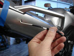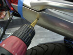 This shows the fender being removed and how the 8mm stainless button head allen bolts are to be installed in the Holeshot fender eliminator tray. | |