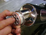 ![]() ![]() | Either remove the muffler or loosen it up and rotate it as shown, then snug back down. Mark the spot to drill the mounting hole, which is 1/2 " in from the edge of the tip bead when installing the DBK-UK part number. Center punch as shown. |