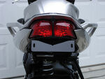 With wires shrink tubed, install the cat eye blinkers onto the stainless bracket with the bracket ears pointing forward. Install the bracket against the tray, then your license plate and frame last. Adjust up and down to your liking and snug down. Neatly route the blinkers wires through the large hole in fender eliminator tray and plug back into the bike's wiring harness. You may want to use a couple small black nylon ties to do a neat job. | |